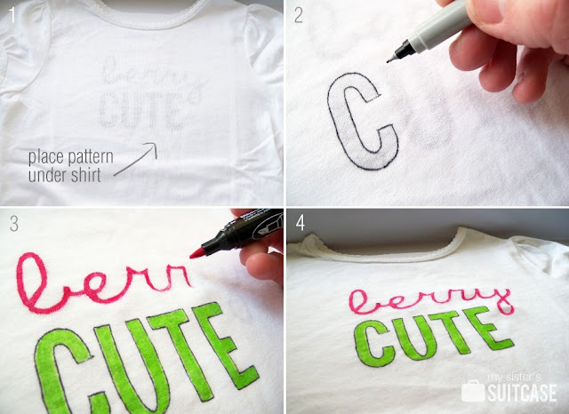 {1} Place the pattern underneath the top layer of your t-shirt {2} Make sure it is centered, then start tracing carefully with your black Sharpie. After all of the letters are outlined, fill in with a fabric marker. It is easy to use because the tip is shaped like a brush and distributes the color nicely. {3} Continue tracing your design. For the “berry” I used a chisel tip fabric marker. It worked well for precision and adding a little extra thickness to the letters. {4} Let your design dry completely before you wash. (Oh, and you should “heat set” the design by throwing it in the dryer before you wash it.)