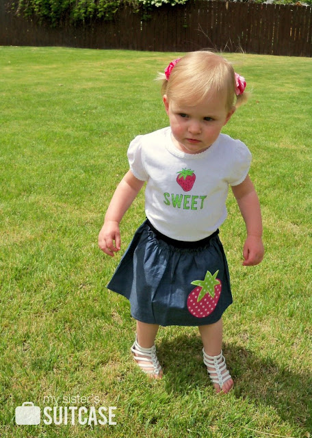 I got the little chambray skirt at Target for $5, and the adorable strawberry {iron-on} applique at JoAnn’s on clearance for 50 cents!! The shirt was only $3, plus the cost of my markers. Now these cute cousins will have fun wearing matching outfits next week 🙂